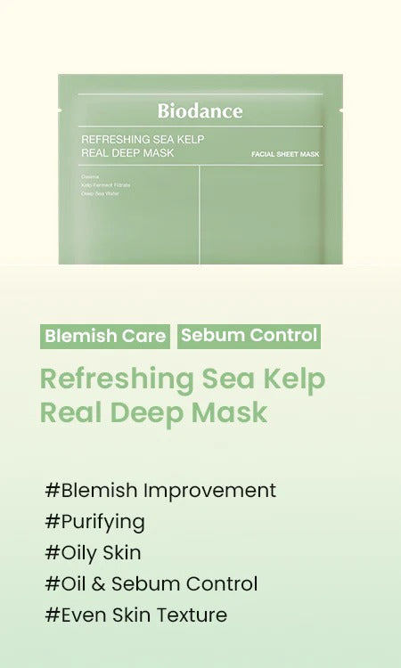 Dive into a refreshing skincare experience with the Biodance Refreshing Sea Kelp Real Deep Mask. This invigorating sheet mask harnesses the purifying power of sea kelp to deeply cleanse pores, control excess oil, and provide a burst of hydration to tired skin.
