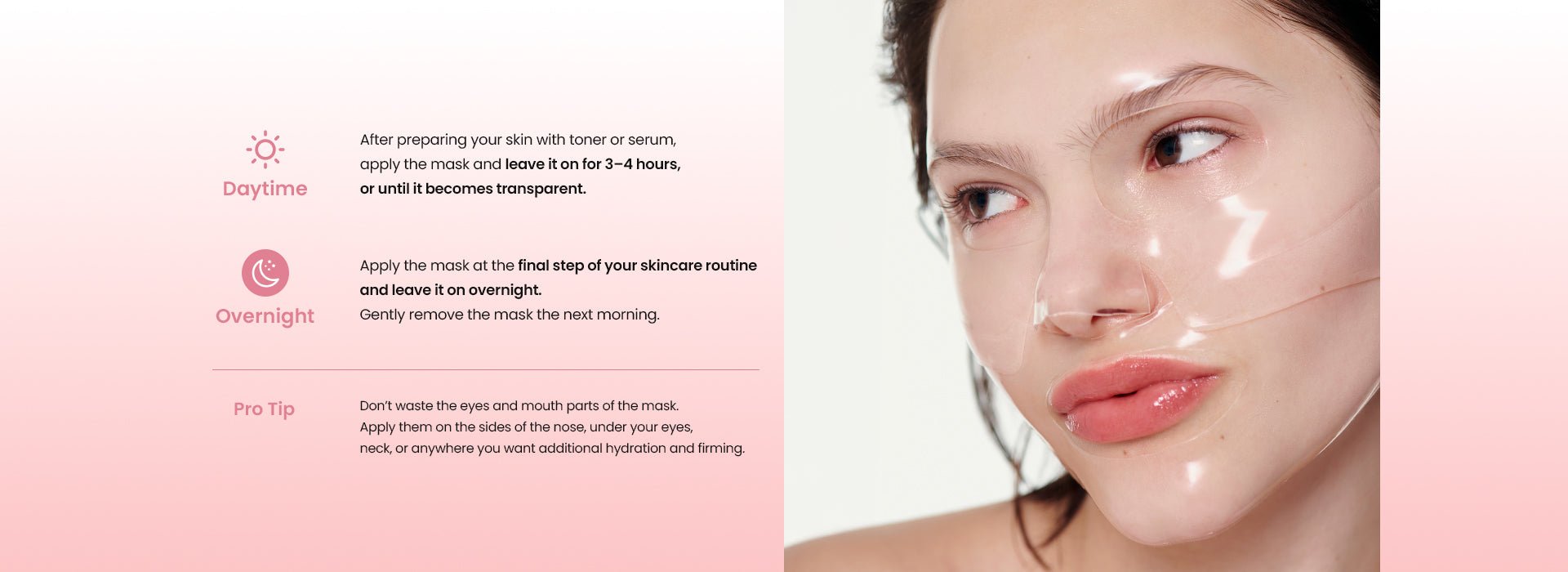 Bio Collagen Real Deep Mask is a hydrogel mask molded with essence to provide hydration. Longer use enhances the absorption of safe ingredients, and its excellent adhesion over time makes it suitable for overnight use or for 3-4 hours during the day.